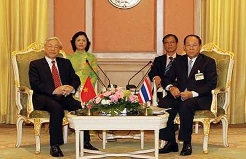 | Tổng Bí thư Nguyễn Phú Trọng hội kiến với Chủ tịch Thượng viện Thái Lan Nikom Wiratpanich. (Ảnh: TTXVN) |