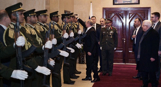 Tổng thống Nga Vladimir Putin nhặt mũ và đội lại ngay ngắn cho một quân nhân Palestine trong buổi tiếp đón ở Bờ Tây.