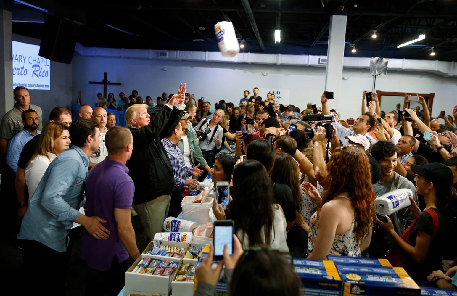 Ông Trump trực tiếp tham gia phân phát giấy và nhu yếu phẩm cho người dân Puerto Rico. (Ảnh: Reuters)