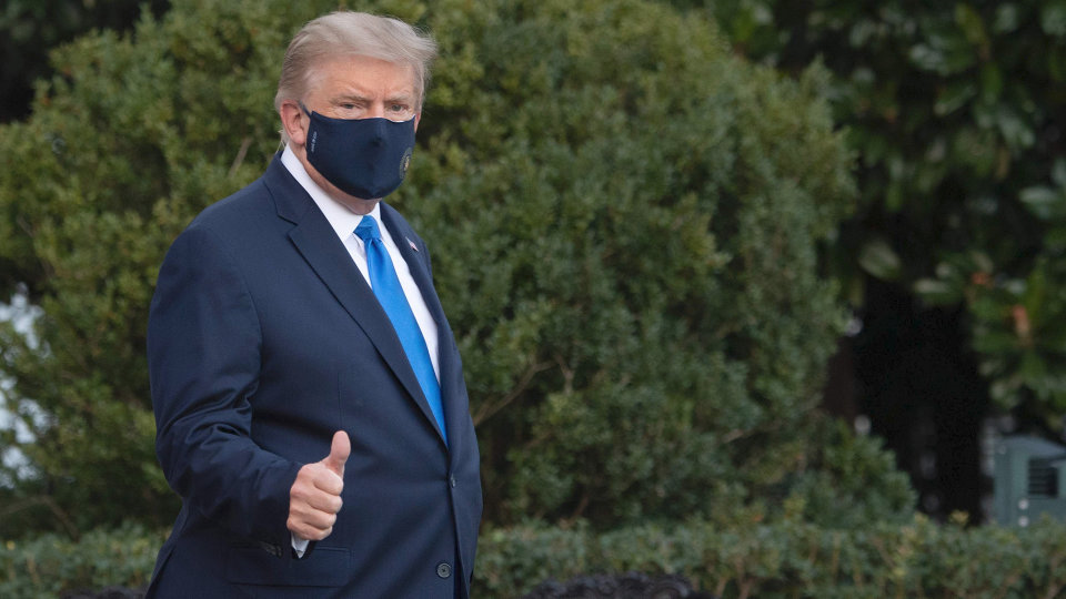 Tổng thống Trump giơ ngón cái chào phóng viên, nói “cảm ơn rất nhiều”, trước khi ra trực thăng Marine One về Nhà Trắng chiều ngày 5/10 (theo giờ địa phương).