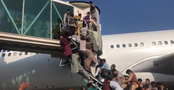 Một video khác ghi lại cảnh hàng chục người chen lấn để leo lên một chiếc máy bay đậu ở sân bay Hamid Karzai với hy vọng có thể rời khỏi đất nước.
