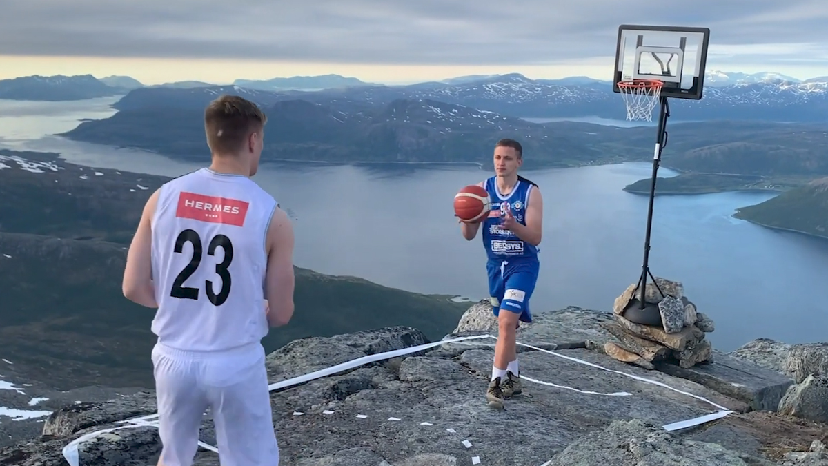 Chàng trai Na Uy Joakim Jorgensen cùng bạn chơi bóng rổ trên đỉnh núi Store Blamann và ghi hình lại toàn bộ quá trình.