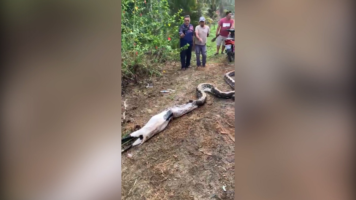 Con trăn gấm nặng 77 kg bị bắt ở trang trại sau khi nuốt chửng một con dê và không thể di chuyển ở Malaysia.
