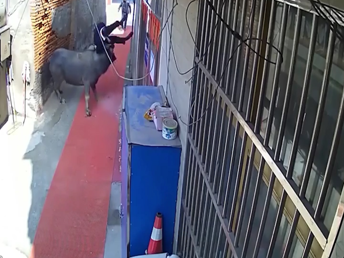Một con trâu điên chạy khỏi lò mổ đã húc văng 2 người trong một con hẻm tại Chiết Giang, Trung Quốc.