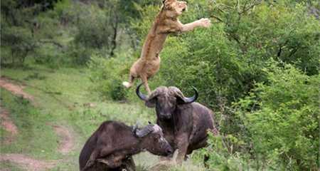Lao đến và ra đòn dũng mãnh như một chiến binh, con trâu rừng đã húc tung con sư tử lên cao rồi quật đến chết để cứu bạn.