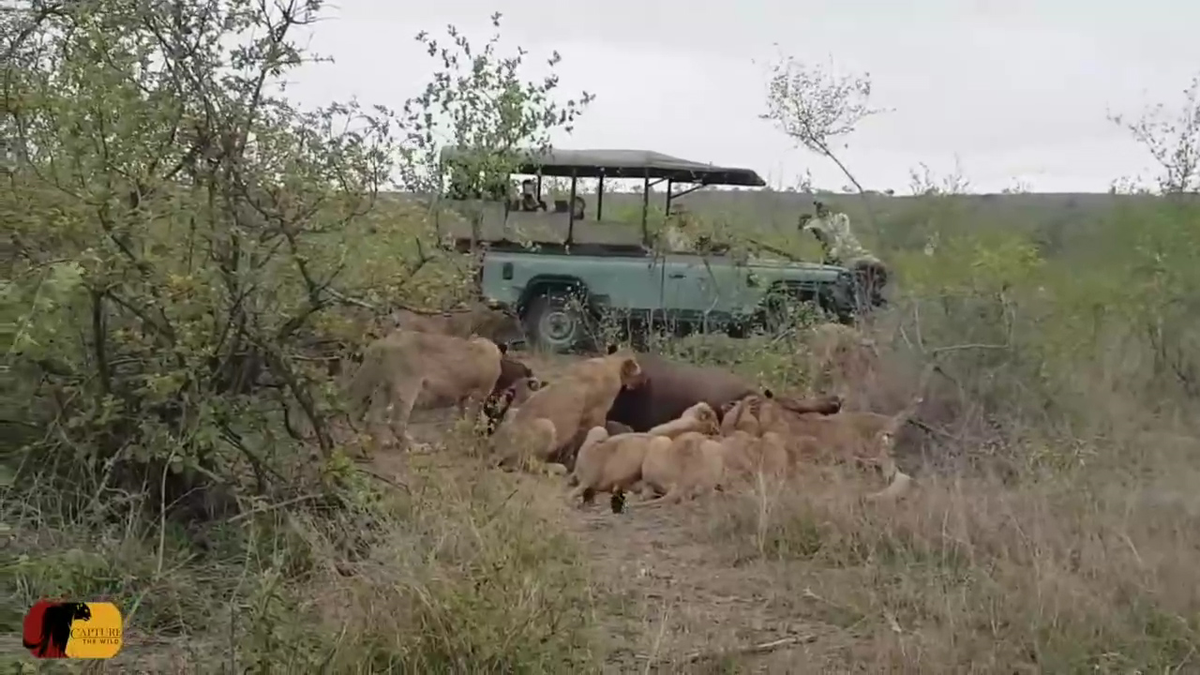 Bị đàn sư tử quật ngã xuống đất rồi lao vào cắn xé dữ dội, trâu rừng vẫn vung chân đạp một con sư tử cái văng ra xa rồi thoát thân thần kỳ.