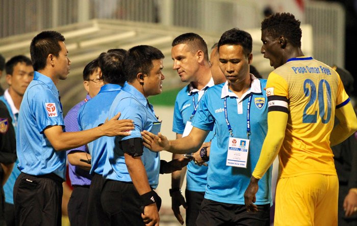 Tổ trọng tài điều khiển trận HAGL vs FLC Thanh Hóa có một trận đấu gây nhiều tranh cãi. (Ảnh": Hùng Linh)