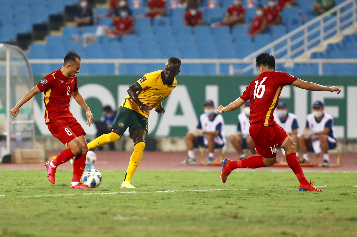 Phút 28, tuyển Việt Nam có pha tấn công sắc nét ở cánh phải. Quang Hải xoay sở tốt và chuyền cho Tiến Linh, trước khi tiền đạo mang áo số 22 nhả bóng cho Hồng Duy dứt điểm bên ngoài vòng 16m50. Bóng chạm tay hậu vệ Rhyan Grant ở tình huống này.