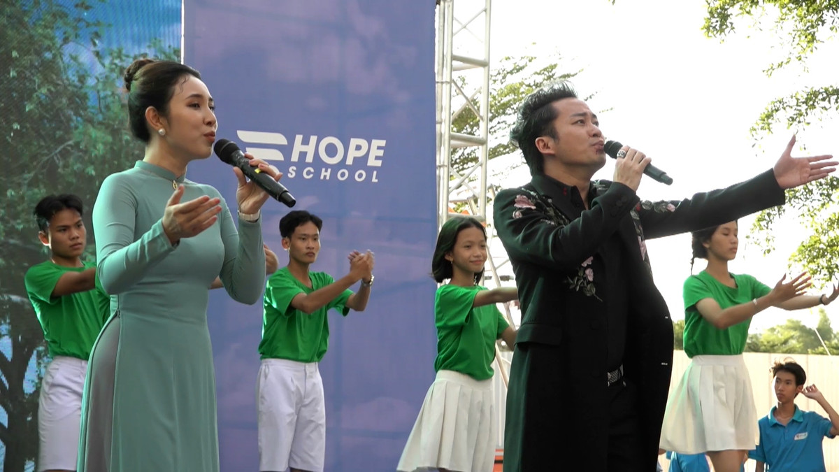 Ca sĩ Tùng Dương và Bảo Trâm cùng góp giọng trong ca khúc “Người gieo mầm xanh”, tạo nên khoảnh khắc xúc động tại Ngày hội tới trường Trường Hy Vọng.