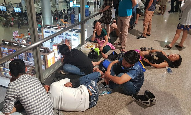 Đêm 6/2 rạng sáng 7/2, tại khu vực sảnh nhà ga quốc tế Tân Sơn Nhất, dòng người đứng, ngồi la liệt, có người gục ngủ tại sân bay trong lúc chờ người thân.