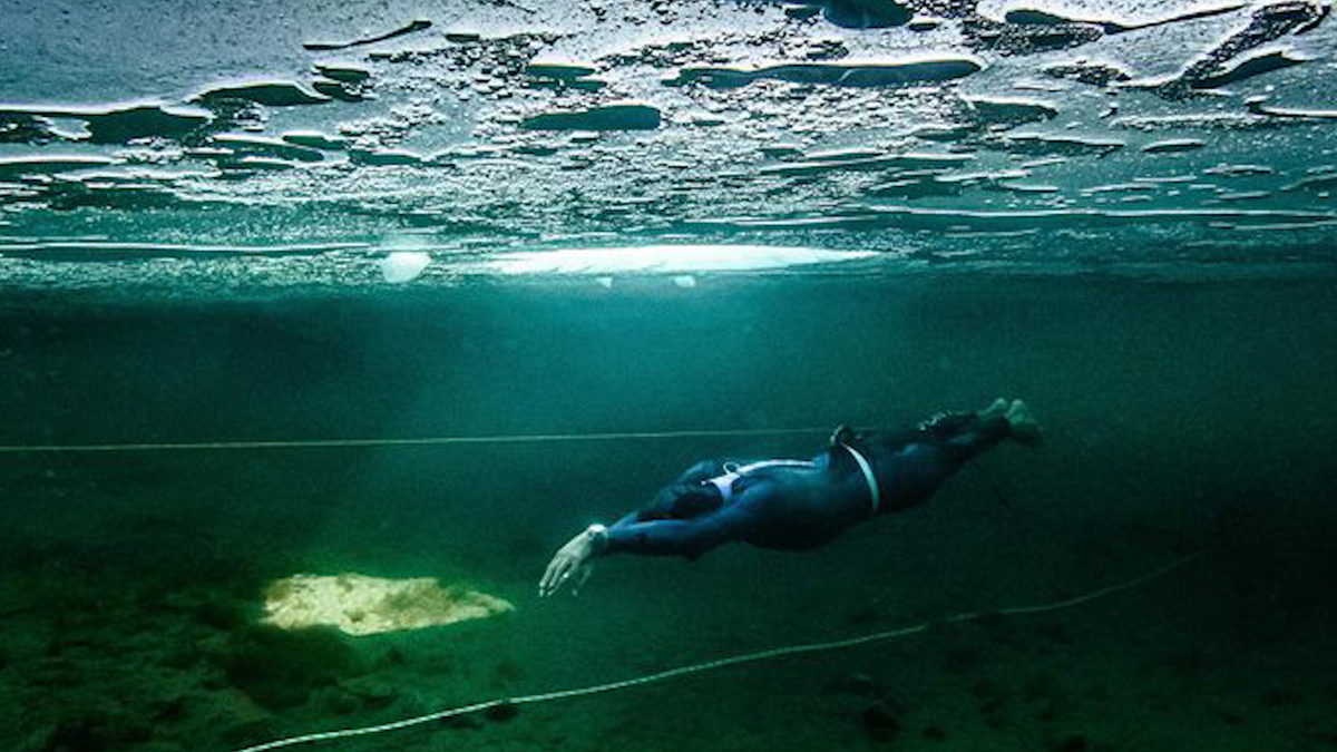 Arthur Guerin-Boeri, vận động viên lặn người Pháp, vừa thiết lập kỷ lục thế giới khi chinh phục quãng đường 120 m dưới mặt băng lạnh giá chỉ trong một lần thở.