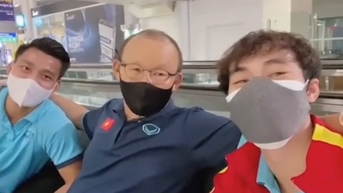 Cầu thủ Văn Toàn cùng Văn Thanh hướng dẫn HLV Park Hang-seo nói lời cảm ơn bằng tiếng Việt khiến nhiều người thích thú.