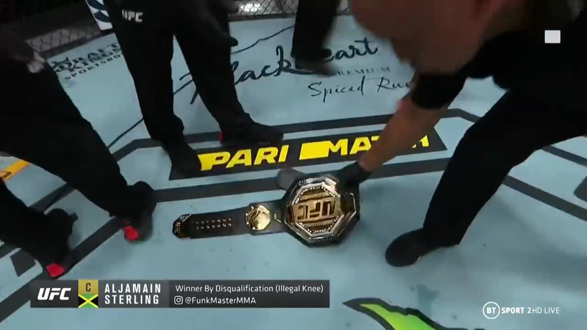 Võ sĩ Aljamain Sterling quăng bỏ đai vô địch UFC 259 và cho rằng chiến thắng không xứng đáng, sau khi bị đối thủ lên gối không đúng luật khiến anh nằm dài trên sàn.