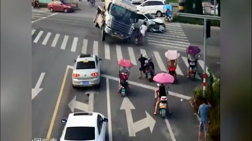 Vượt đèn đỏ, xe trộn bê tông lật nghiêng đè trúng xe máy ở ngã tư ở tỉnh Chiết Giang, Trung Quốc.