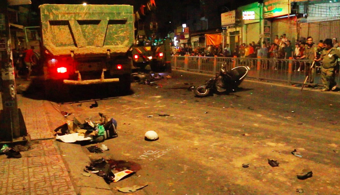 - xe ben cuốn hàng loạt xe máy vào gầm