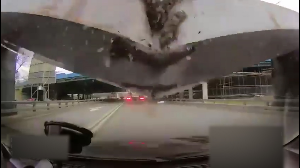 Sau khi bị thùng của chiếc xe bồn va trúng, cây cầu vượt qua đại lộ Rublevo - Uspenskoe (Nga) bất ngờ gãy đôi, đổ sập xuống ô tô con vừa chạy tới.