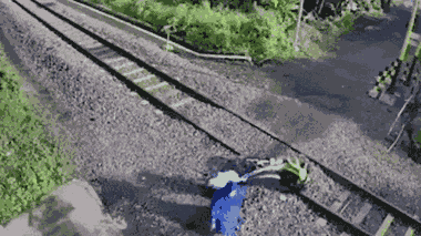Người mẹ chạy xe máy chở hai con nhỏ khi đến giữa đường ray ở Đông Java, Indonesia thì bị mắc kẹt, họ cố kéo xe nhưng bất thành, đoàn tàu lao đến tông nát xe máy.