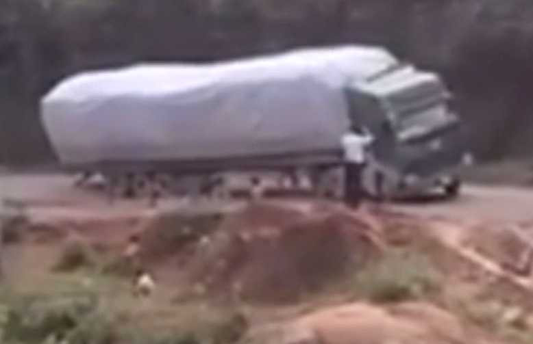 (VTC News) - Mặc dù đã lùi rồi tiến, căn chỉnh khá cẩn thận nhưng do sức nặng của hàng hoá và mặt đường bị hư hỏng đã khiến chiếc xe tải chở gạo lật nghiêng tại Yên Bái.