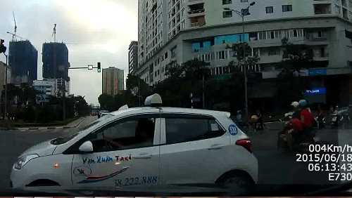 | Xe taxi vượt đèn đỏ cắt ngang đầu một ô tô khác (Ảnh cắt từ clip) |