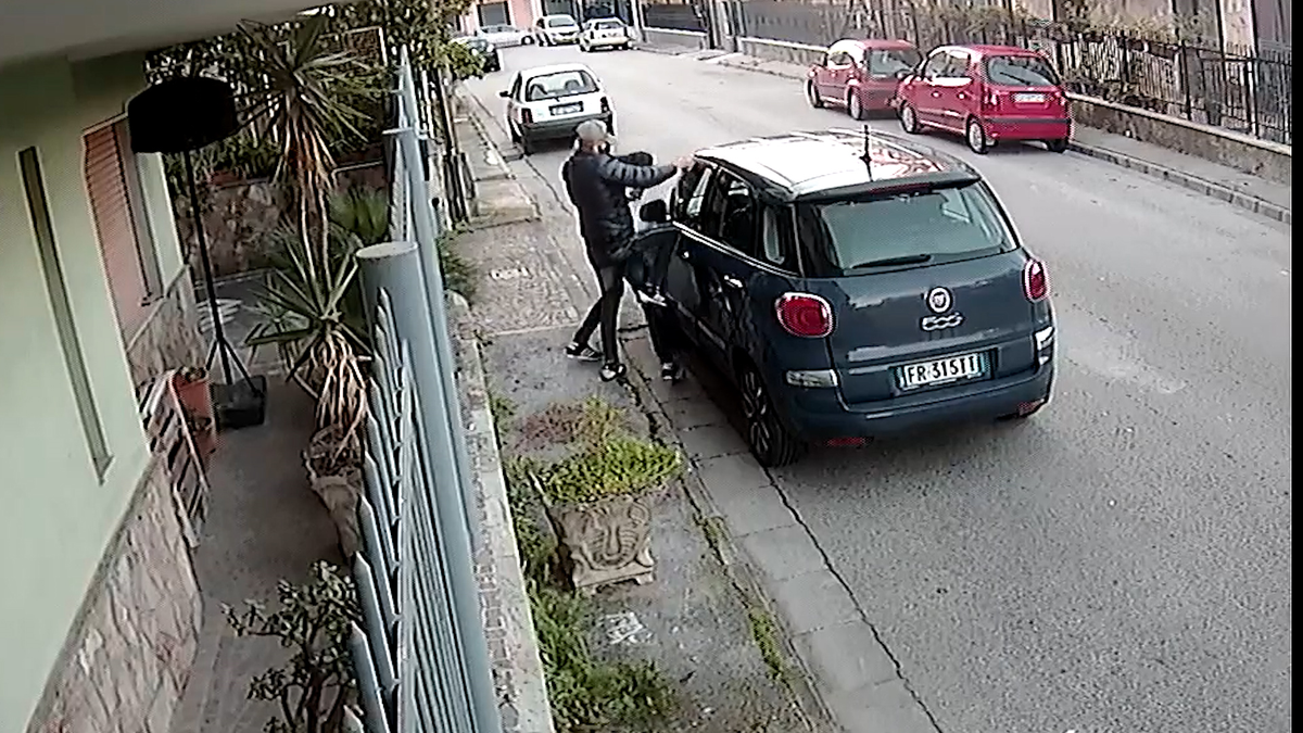 Hai người đàn ông dùng nạy mở cửa xe và cùng lúc một ô tô khác xuất hiện đẩy chiếc xe đi chỉ trong vòng 30 giây tại Italy.