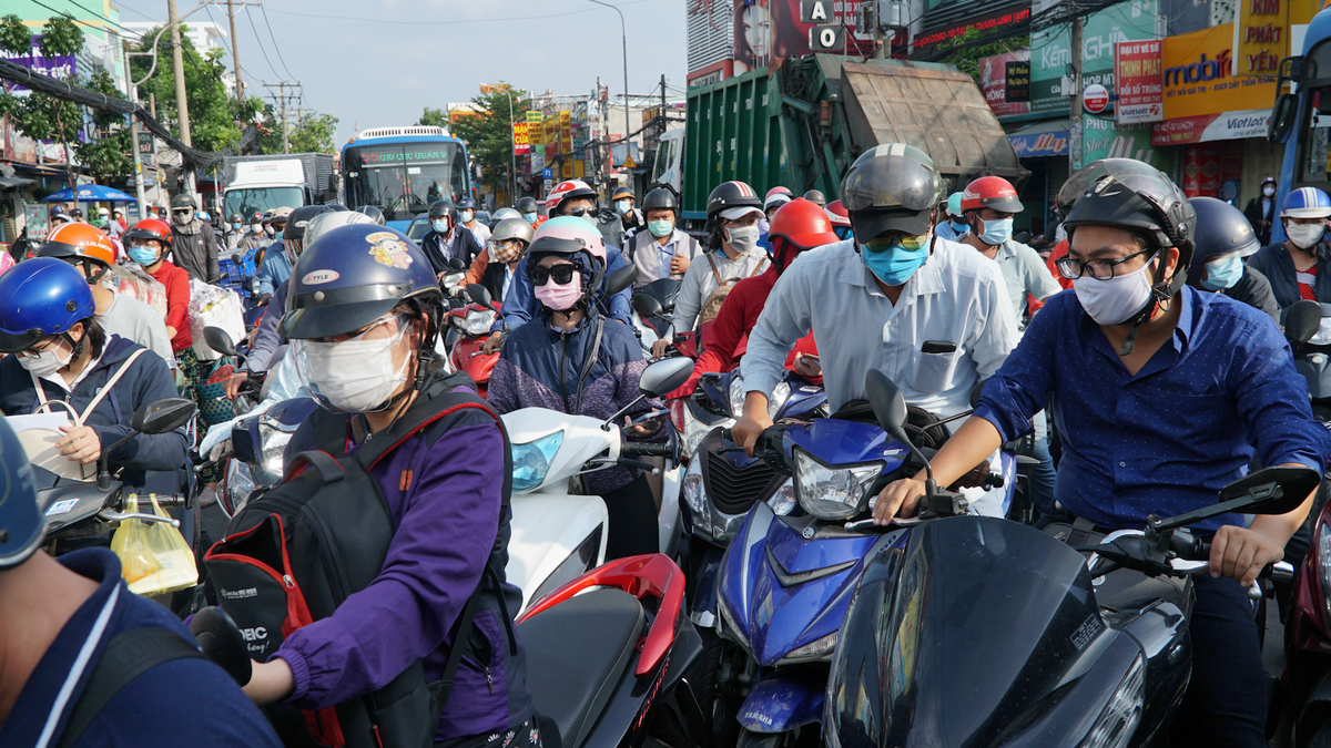 Sáng 1/6, người dân ra vào quận Gò Vấp, xuất trình giấy tờ và khai báo y tế tại các chốt kiểm soát, trên đường Quang Trung người dân xếp hàng dài cả km chờ qua chốt.
