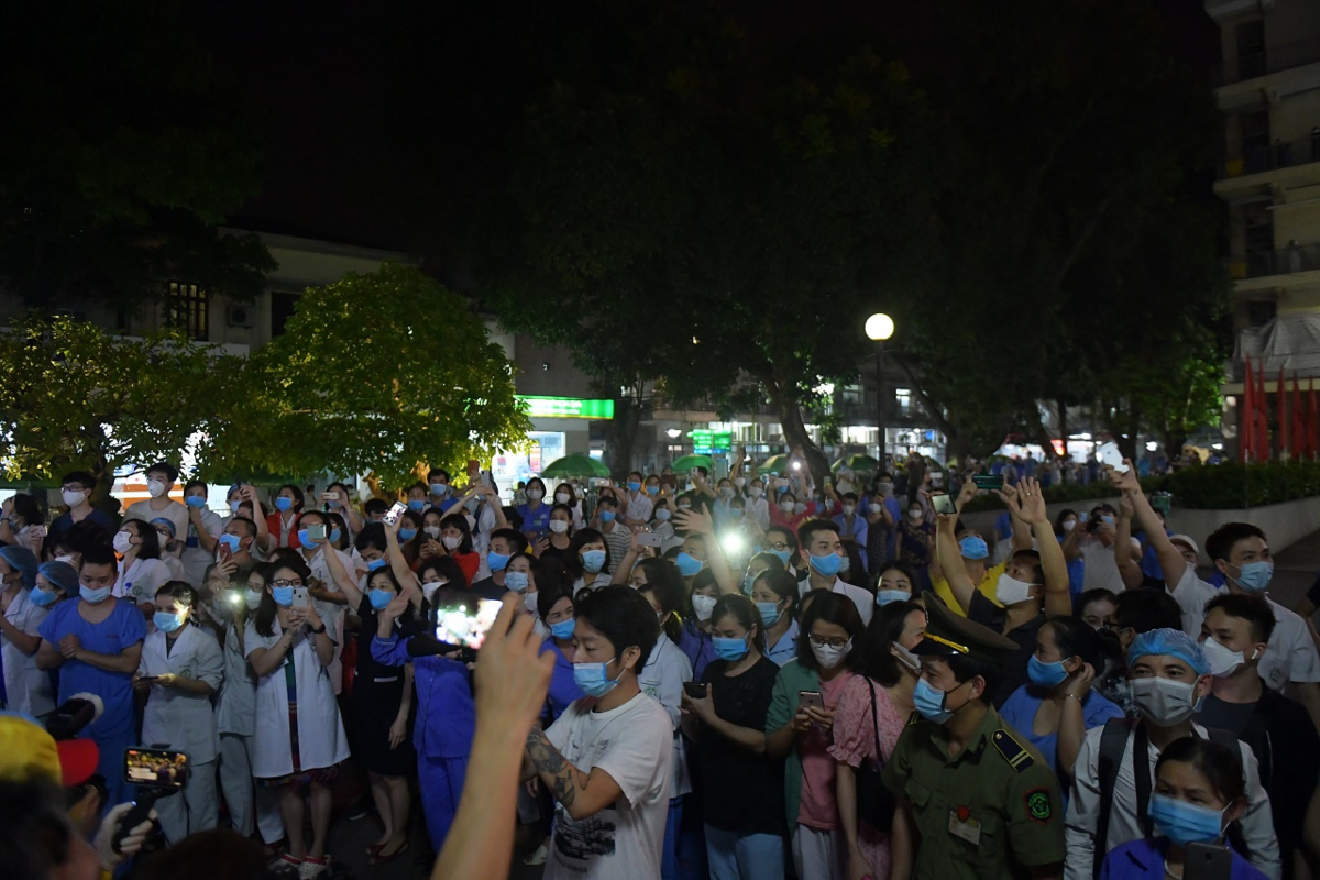 Hàng rào phong toả bệnh viện Bạch Mai được dỡ bỏ trong tiếng reo hò của hàng trăm nhân viên y tế, lúc 0h ngày 12/4.