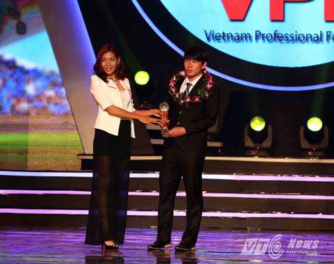 | Minh Vương nhận danh hiệu cầu thủ trẻ xuất sắc nhất V-League 2014 (Ảnh: Quang Minh) |