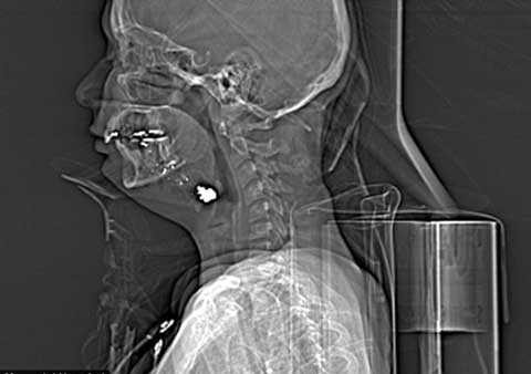(VTC News) - Hình ảnh X-quang cho thấy viên đạn bị mắc kẹt trong cổ nạn nhân sau khi cô này bị bắn xuyên má trôi xuống cổ.
