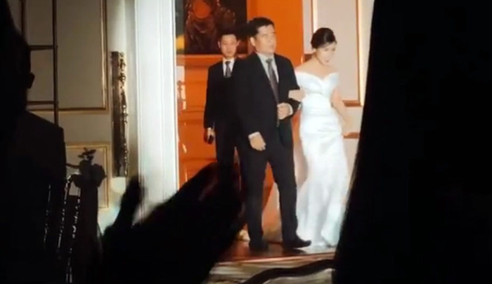 Trong giờ phút thiêng liêng, mọi sự chú ý đổ dồn về phía cánh cửa trắng. Cô dâu Viên Minh cùng người cha thân yêu bước vào hội trường. Nàng WAG diện trên mình chiếc váy màu trắng tinh khôi với thiết kế trễ vai giúp khoe bờ vai trần mảnh mai. Viên Minh chắc chắn là người xinh đẹp và hạnh phúc nhất buổi tối hôm nay. Cô nàng bước đi bên cha đầy tự tin, gương mặt luôn nở nụ cười rạng rỡ. Sau đó là khoảnh khắc mọi người cùng nâng ly chúc mừng hạnh phúc đôi bạn trẻ.