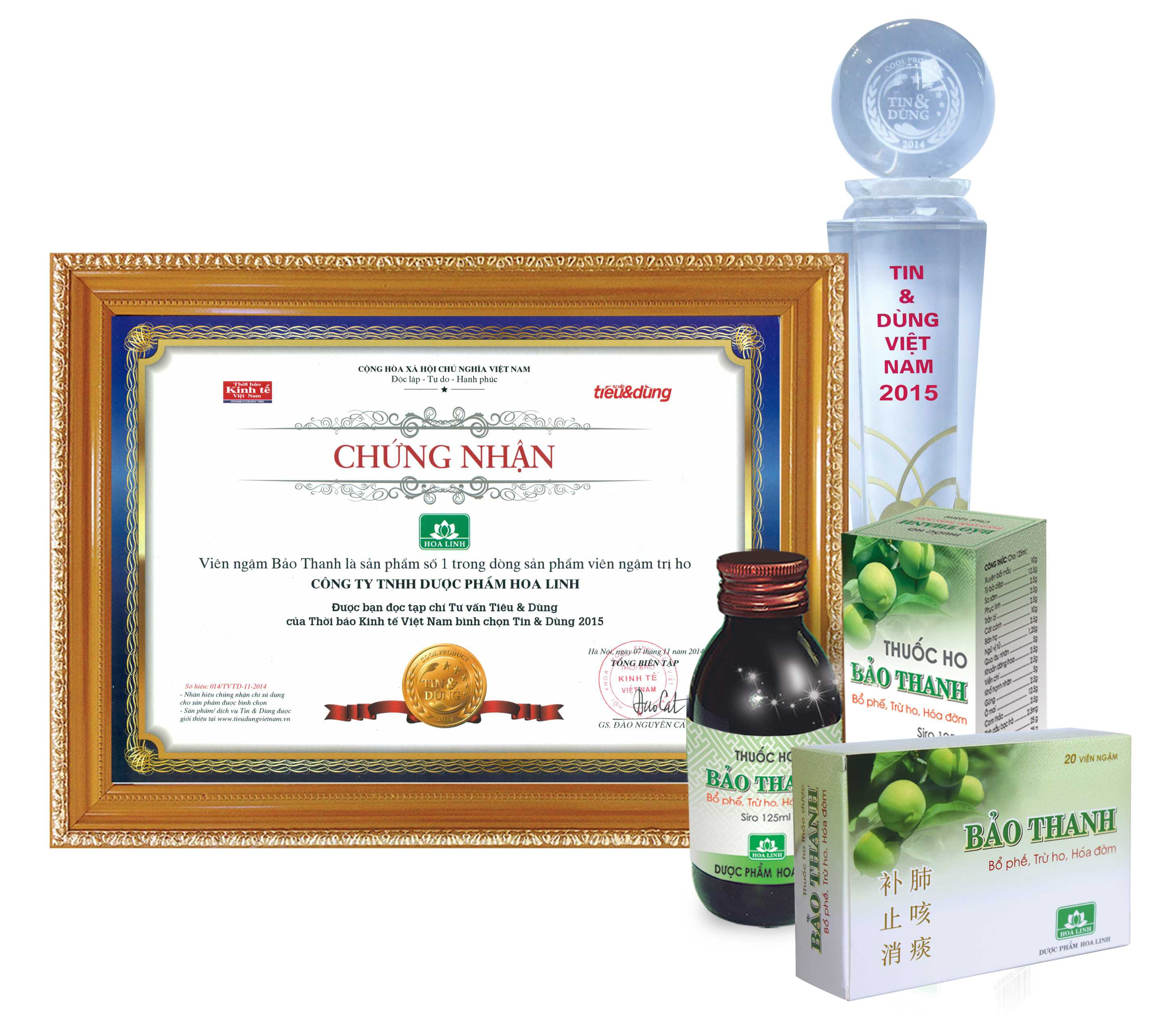 Sự kiện vinh danh và trao tặng chứng nhận Viên ngậm Bảo Thanh - sản phẩm số 1 trong dòng viên ngậm trị ho, bổ phế, cùng gần 100 sản phẩm/dịch vụ được tin dùng khác được tổ chức long trọng ngày 6/11/2015, tại Tp.HCM, do Thời Báo Kinh tế Việt Nam, cùng Bộ công thương phối hợp tổ chức.