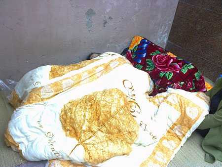 Bà N.T.V ở Hưng Yên lên Hà Nội chăm con đang mang bầu phải nằm trong bệnh viện phụ sản TW để giữ thai chờ ngày đẻ. Trời lạnh, người nhà bệnh nhân không có chỗ lưu trú qua đêm nên cứ tối đến lại trải chiếu nằm ở hành lang bệnh viện.