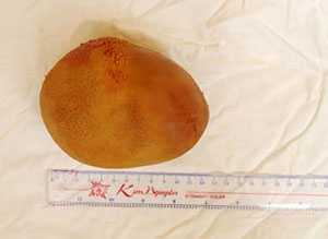 Viên sỏi được lấy ra to bằng cái chén, kích thước 10 x 9,8 x 10cm và nặng 0,8kg.
