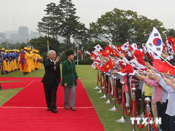 | Tổng thống Hàn Quốc Park Geun-hye và Tổng Bí thư Nguyễn Phú Trọng tại Lễ đón - Ảnh TTXVN |
