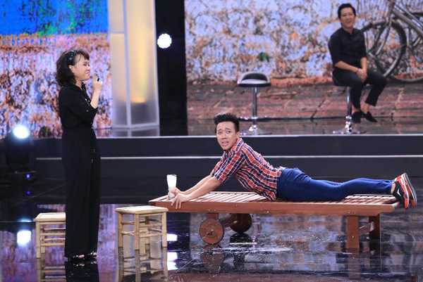 Việt Hương, Trấn Thành, Hoàng Mập 'lăn lộn' trên sân khấu đứng, ngồi, nằm. 'Chưa từng thấy một nhóm hài nào tự hại nhau như vậy' – đó là nhận xét của Hoài Linh về tình huống kịch này.