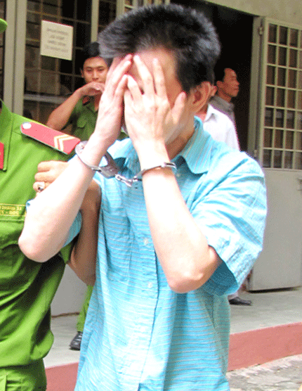 | Tại phiên tòa, Việt Kiều Việt Anh luôn lấy tay che mặt lại khi bắt gặp ống kinh của phóng viên |