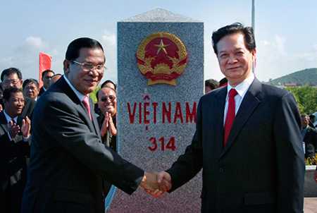 | Thủ tướng Chính phủ Nguyễn Tấn Dũng và Thủ tướng Chính phủ Hoàng gia Campuchia Samdech Hunsen bên cột mốc phía Việt Nam |
