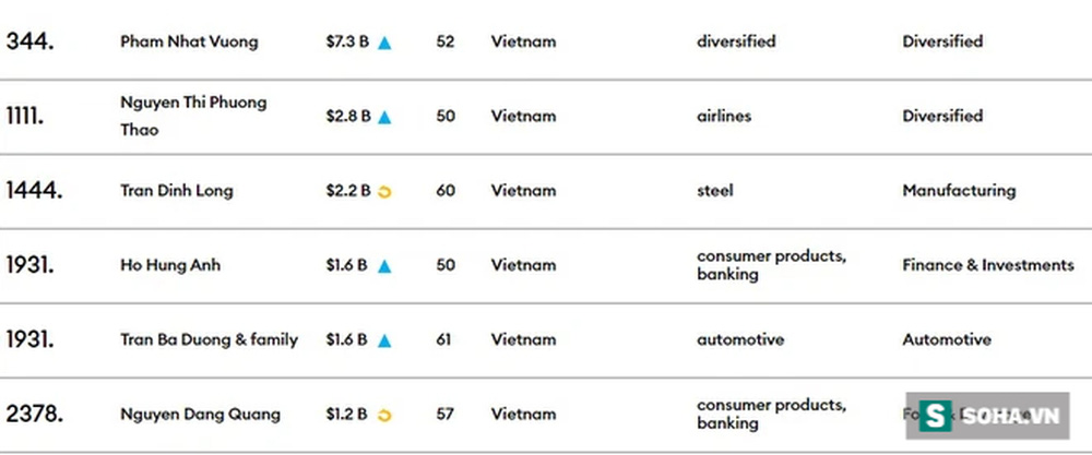 Vị trí 1444 thuộc về ông Trần Đình Long - Chủ tịch Hòa Phát với 2,2 tỷ USD. Ông Hồ Hùng Anh - Chủ tịch Techcombank và ông Trần Bá Dương cùng ở vị trí 1931, tài sản là 1,6 tỷ USD. Ông Nguyễn Đăng Quang - Chủ tịch Masan đang đứng ở 2378, tài sản là 1,2 tỷ USD.