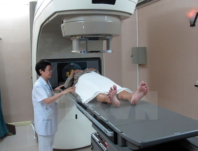 Máy xạ trị gia tốc thế hệ mới đang xạ trị cho bệnh nhân ung thư cổ tử cung. (Ảnh: Phương Vy/TTXVN)