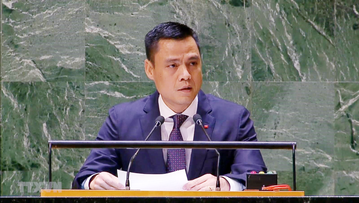 Đại sứ Đặng Hoàng Giang, Trưởng Phái đoàn thường trực Việt Nam tại Liên hợp quốc, phát biểu tại một phiên họp của Đại hội đồng Liên hợp quốc. (Ảnh: TTXVN phát)