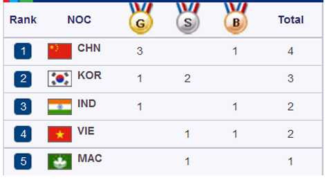 Theo bảng tổng sắp huy chương tính đến 9h40' sáng nay, Đoàn thể thao Việt Nam đang cùng Đoàn Mông Cổ, Nhật Bản, Ấn Độ chia sẻ vị trí thứ 4. Dẫn đầu đang là Trung Quốc với 3 HCV, Hàn Quốc đứng thứ 2 với 1 HCV.