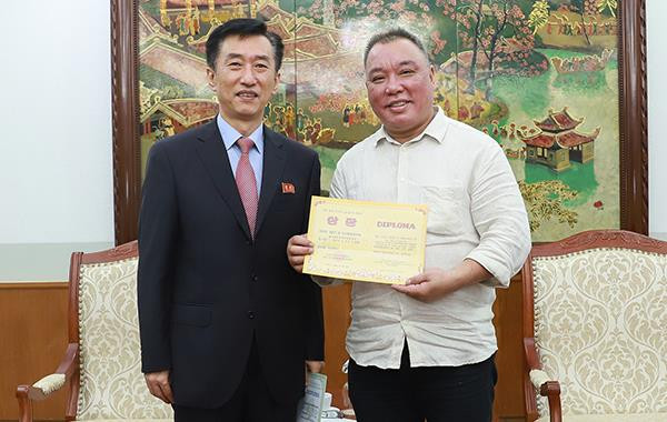 Nhận ủy quyền của BTC Liên hoan nghệ thuật quốc tế hữu nghị Mùa xuân Bình Nhưỡng tháng 4, sáng 26/5, Đại diện lâm thời Đại sứ quán nước Cộng hòa Dân chủ Nhân dân Triều Tiên Ri Ho Jun trao giải thưởng cho các nghệ sĩ Việt Nam.