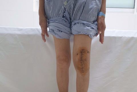 Tháng 3, bệnh nhân tới khám lại, kết quả xét nghiệm cho thấy tình trạng viêm giảm nhiều, phim chụp đánh giá không còn áp-xe khớp gối. Do đó, các bác sĩ khoa Ngoại tổng hợp quyết định phẫu thuật thay khớp gối cho bệnh nhân, giúp bà T. trở lại cuộc sống bình thường.
