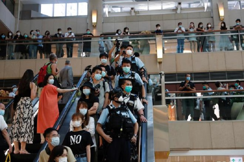 Cảnh sát chống bạo động tuần tra tại trung tâm mua sắm sau khi Trung Quốc thông qua luật an ninh Hong Kong hôm 30/6. (Ảnh: Reuters)