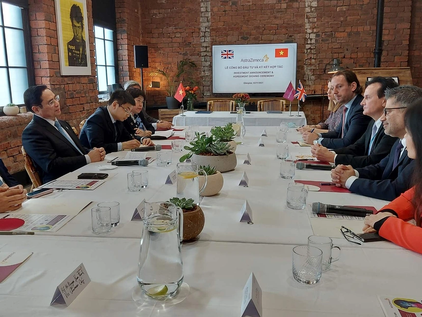 “Chúng tôi vui mừng vì được tiếp đón ở một địa điểm ấm áp và hấp dẫn. Tôi cảm thấy rất thoải mái”, Thủ tướng Phạm Minh Chính mở đầu phần phát biểu của mình. Ông chia sẻ mong muốn hợp tác với AstraZeneca xuất hiện trước khi đoàn đại biểu cấp cao của Việt Nam sang dự Hội nghị COP26 ở Vương quốc Anh.