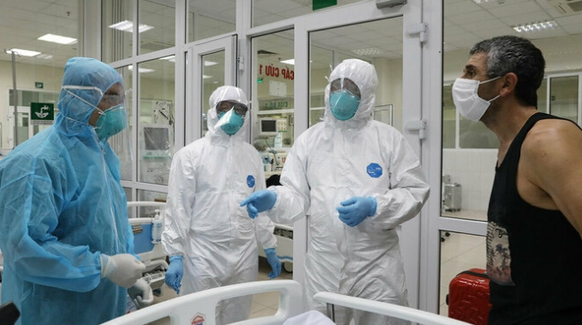 Quan chức y tế và y bác sĩ thăm bệnh nhân COVID-19 tại khoa Cấp cứu, Bệnh viện Bệnh nhiệt đới Trung ương ngày 24/2.