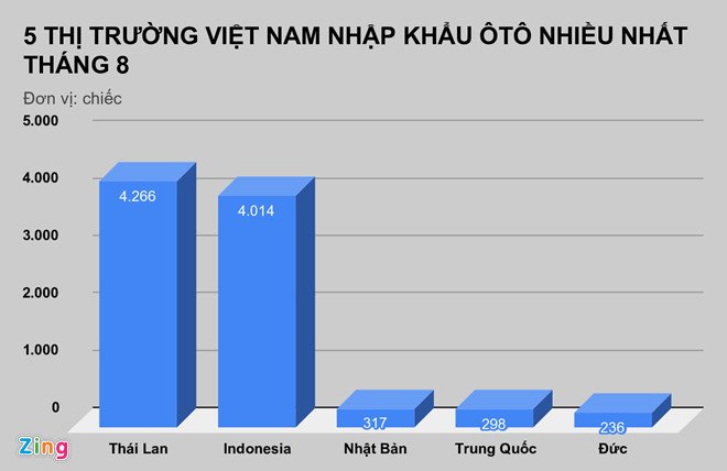 Thái Lan (4.266 xe) và Indonesia (4.014) vẫn là 2 thị trường Việt Nam nhập khẩu ôtô nhiều nhất. Đứng ở vị trí thứ 3 và thứ 4 lần lượt là Nhật Bản (317 xe) và Trung Quốc (298 xe). Thứ 5 là Đức với 236 xe. Số xe nhập khẩu từ 5 thị trường này chiếm tới 97% tổng lượng xe nhập khẩu vào Việt Nam trong tháng.
