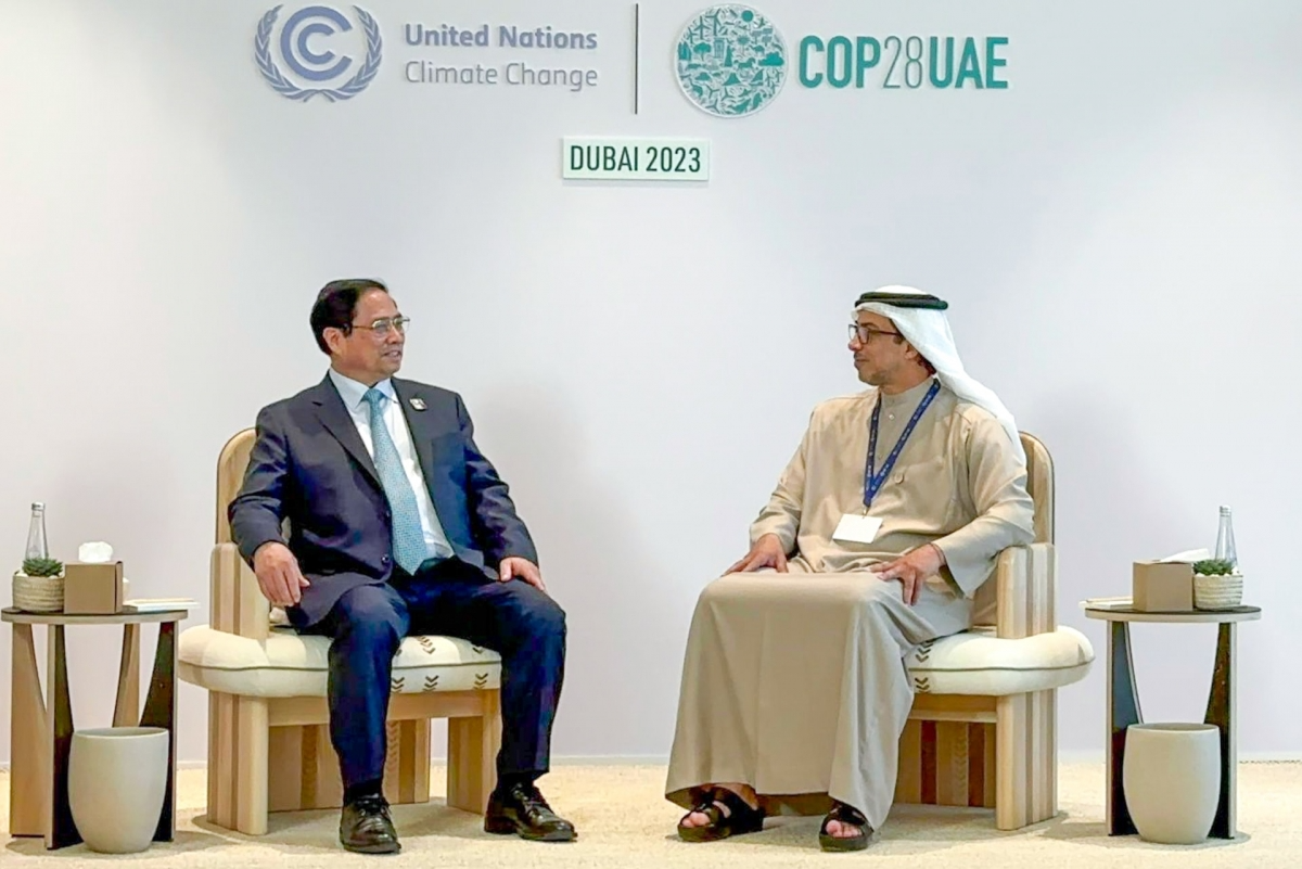 Thủ tướng Phạm Minh Chính tiếp Phó Tổng thống UAE Sheikh Mansour bin Zayed Al Nahyan nhân dịp tham dự Hội nghị lần thứ 28 các bên tham gia Công ước chung của Liên Hợp Quốc về biến đổi khí hậu (COP28) năm 2023. (Ảnh: VGP)