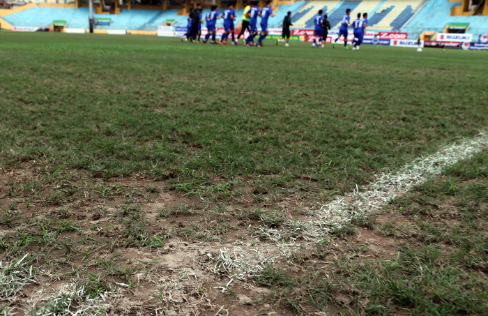 Cỏ sân Hàng Đẫy vốn không phải là cỏ chuyên dụng, lại mọc không đều, đặc biệt vào mùa đông thường chết úa nhiều nên rất xấu. Bên cạnh đó, nền sân rất cứng lại không phẳng, có nhiều chỗ trũng rất dễ gây chấn thương. (Ảnh: Thiện An)