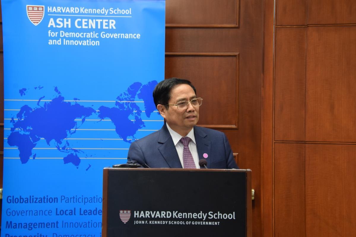 Thủ tướng nhấn mạnh: “Tôi đến đây với tình cảm kép, tình cảm của Đại học Havard dành cho đoàn và tình cảm của mối lương duyên, sự kết nối giữa Việt Nam và Hoa Kỳ. Quan hệ Việt Nam - Hoa Kỳ trải qua những thăng trầm và đột phá, từ khi bắt đầu bình thường hóa quan hệ năm 1995, đã không ngừng phát triển trên tất cả các lĩnh vực. Mối quan hệ toàn diện này vì lợi ích của nhân dân hai nước, vì hòa bình, hợp tác và phát triển trong khu vực và trên thế giới”.