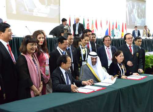 | Bộ trưởng Hoàng Tuấn Anh trong lễ ký nhận quyền đăng cai ASIAD 18 |